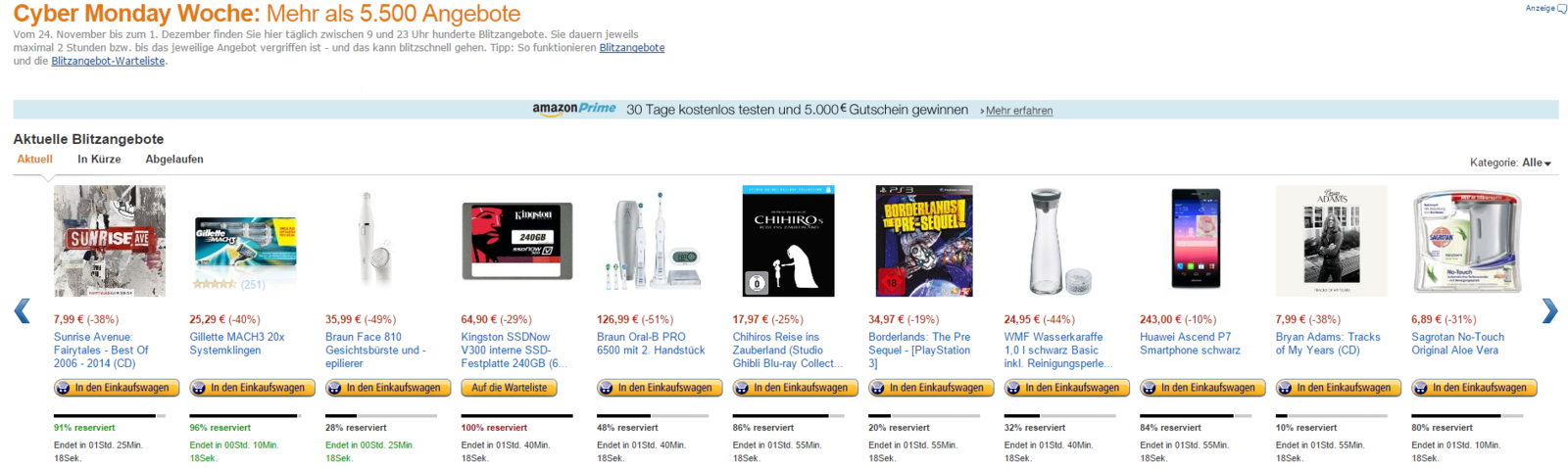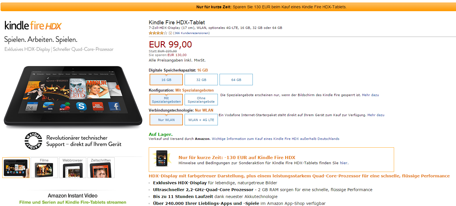 Zudem gibt es in diesem Zeitraum z.B. das Kindle Fire HDX 7 für 99 Euro statt 130 Euro. Die niedrigen Preise der Produkte dauern jeweils maximal 2 Stunden oder bis es vergriffen ist.