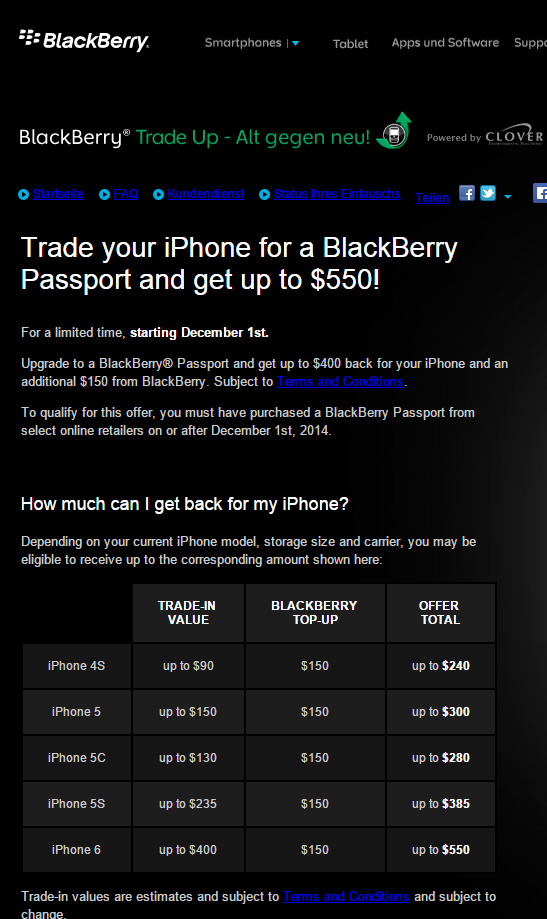 Blackberry will sein neues Spitzenmodell anscheinend mit Lockangeboten an Apple-Nutzer in den Markt zwängen. Dabei werden alle iPhone-Modelle ab dem iPhone 4s angenommen und bringen zwischen 240 und 550 Dollar. Die Aktion startet ab dem 1. Dezember und soll anscheinend unbefristet gelten. So konnte noch keine zeitliche Begrenzung ausgemacht werden. Die einzige Ausnahme bei der Rücknahmeaktion bildet das iPhone 6 Plus. Das Phablet wird nicht in der Liste von Blackberry geführt.
