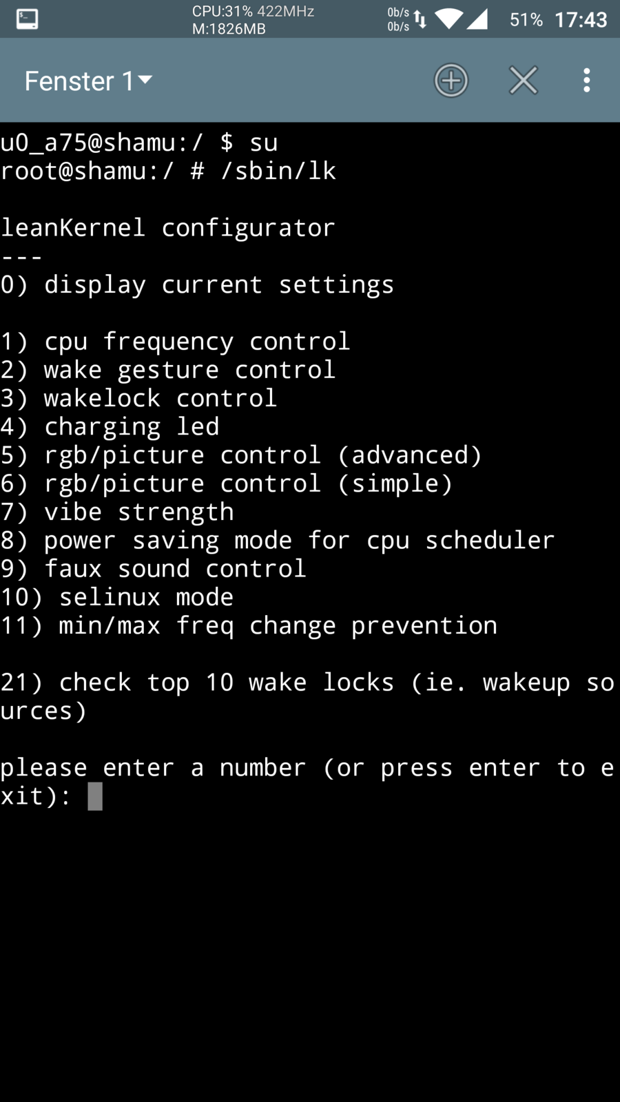 Ihr könnt sowohl das lkconfig-Skript nutzen, um den LeanKernel einzustellen, als auch Apps wie Kernel Tweaker, Trickster Mod, Fauxclock, Kernel Adiutor etc. Um lkconfig aufzurufen, öffnet ihr eine Terminal-App, gebt "su" (ohne Anführungszeichen) ein für Root-Rechte, drückt Enter und dann "/sbin/lk" (ohne Anführungszeichen) und nochmals Enter.