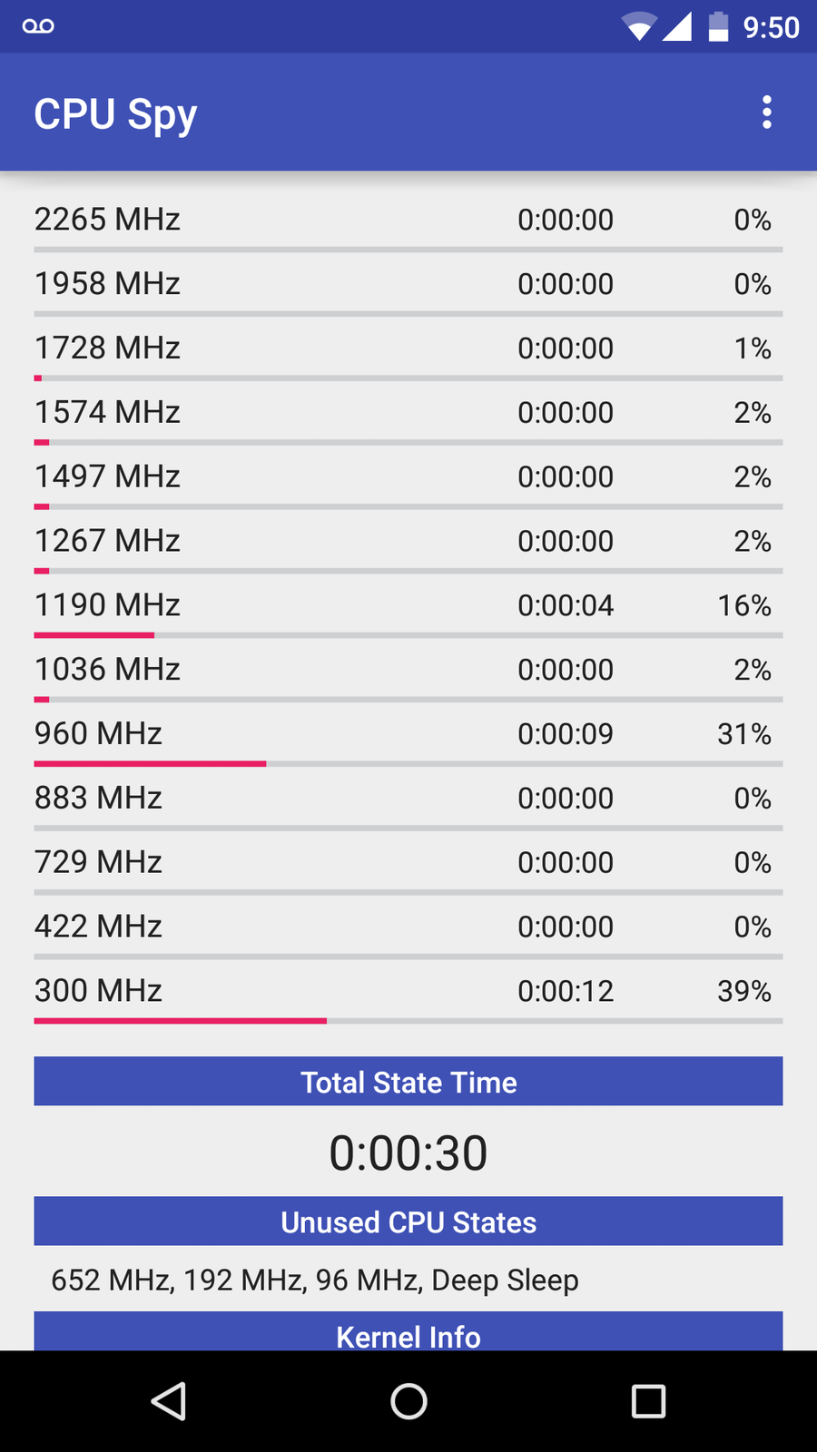 Die App ist für die Leute, die alles über ihr Handy wissen wollen. Der Prozessor in einem Handy läuft nicht immer mit voller Leistung, sondern taktet auf die Leistung, die benötigt wird. Die App kann nicht sehr viel, aber das Eine sehr gut. Man bekommt angezeigt in welchen Taktbereich sich der CPU aufhält. Dies ist sehr entscheidend für die Akkulaufzeit.Besonders hilfreich ist sie, wenn man sich mit Kernel und Govenors beschäftigt, denn so sieht man, ob sie wirklich das bewirken was sie versprechen. Wenn das Handy größenteils im Deep Sleep ist, spart man am meisten Akku. Die Werte auf dem Screenshot erreichte man eher selten mit dem Standardkernel, da muss das Handy schon den ganzen Tag ungenutzt bleiben.