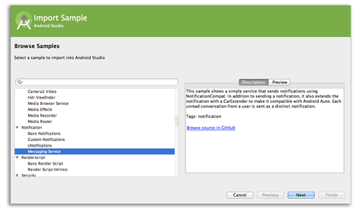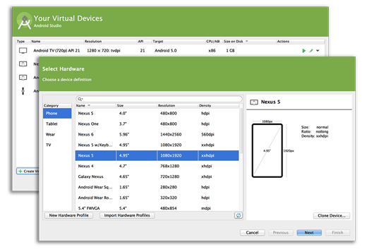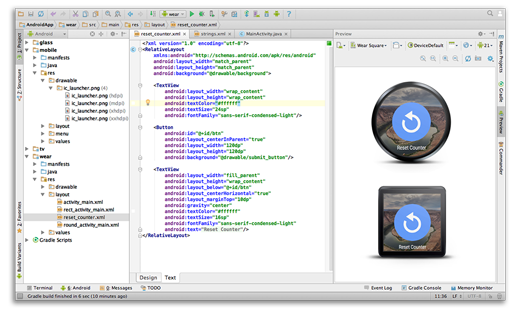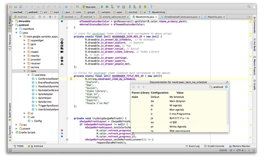 Android Studio enthält auch einen Assistenten mit dem man neue Projektvorlagen oder Google Codebeispiele erstellen kann. Mit Android Studio kann man neben programmieren sich auch eine Vorschau des eigenen Android-Layouts auf mehrere Bildschirmgrößen, Sprachen und sogar API-Versionen anzeigen lassen. Gerade bei Entwicklungen von Apps auf vielen verschiedenen Android-Versionen ist das sicherlich sehr hilfreich. Dazu bekommt man auch ein Performance-Analyse-Tool, den Memory Monitor. Es zeigt die Speicherauslastung der Anwendung an, um diese so besser optimieren zu können.