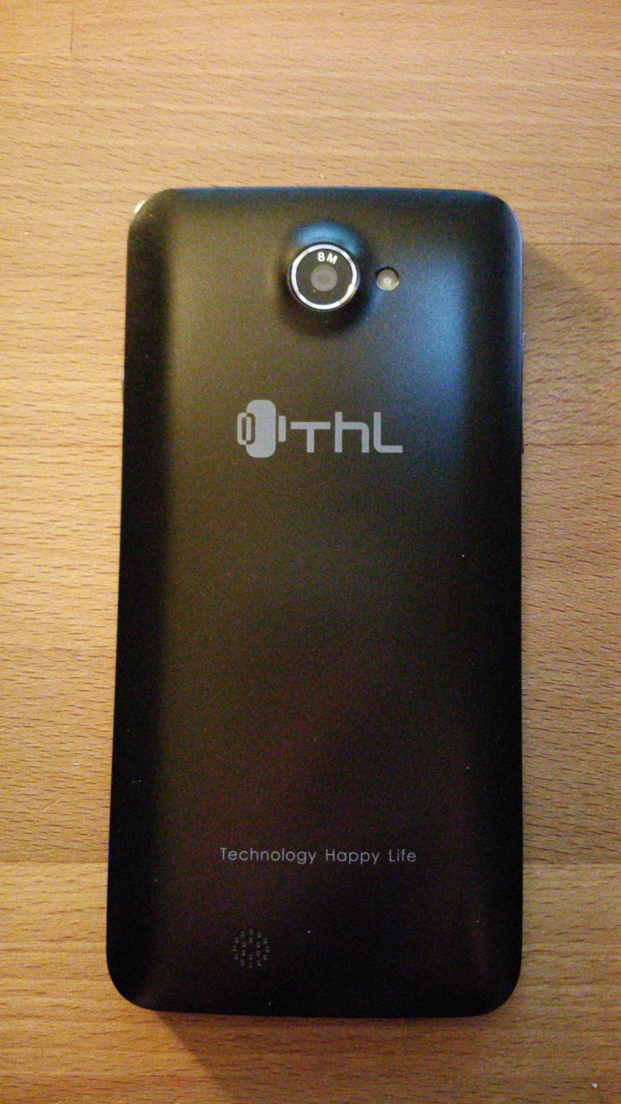 Auf der Rückseite finden wir die 8 MP Kamera mit BSI Funktion und 5 Lens + IR + AF Eigenschaften, daneben den LED Blitz, unten sehen wir den Lautsprecher Ausgang. Wie üblich darüber den THL Slogan „Technology Happy Life“.