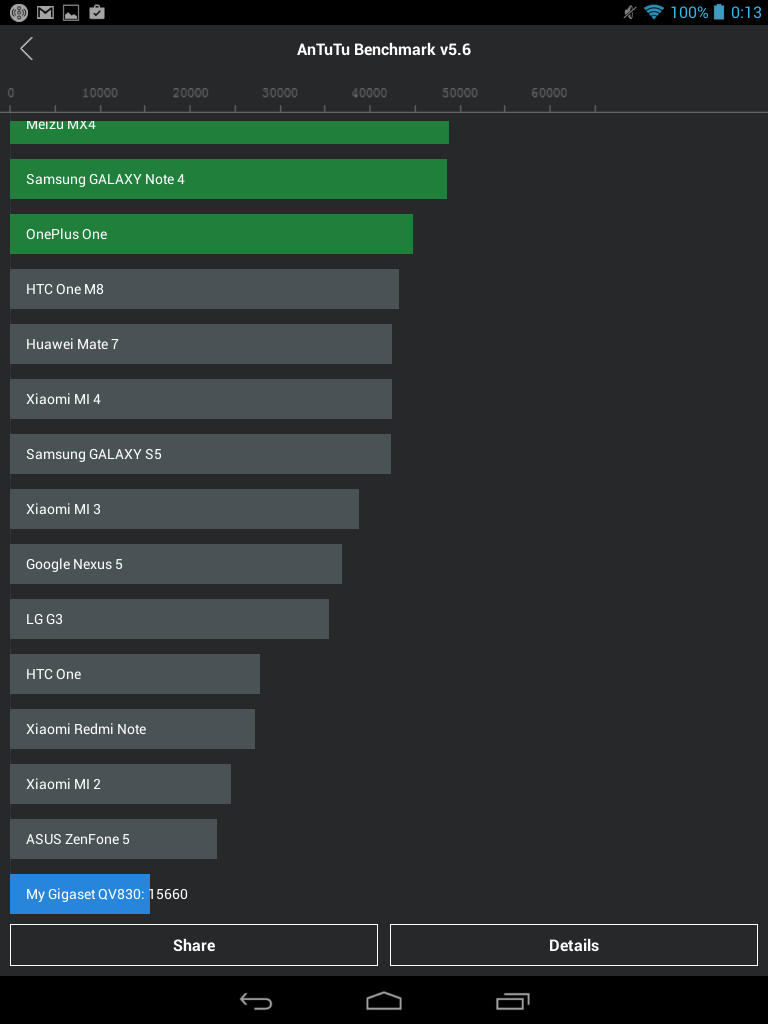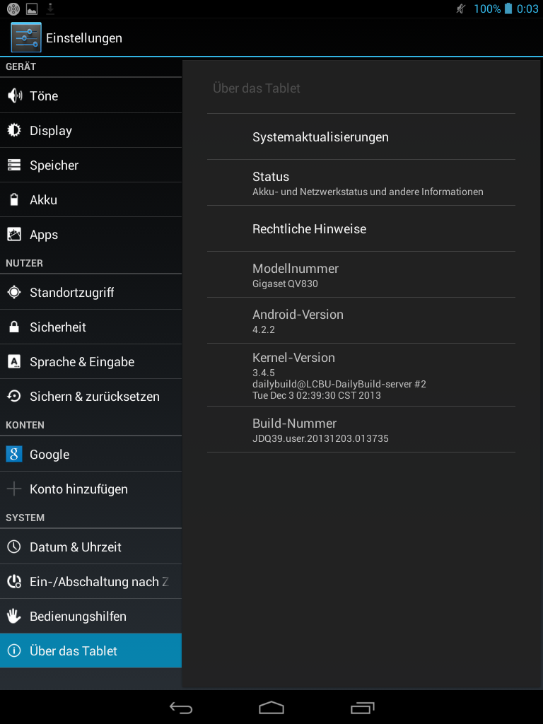 Gigaset liefert das QV830 mit dem Android-Betriebssystem in der Version 4.2.2 aus. Die eingesetzte Android-Version ist fast pures Android. Nur einige vorinstallierte Apps befinden sich auf dem Gerät. Im Antutu-Benchmark erreichte das Gerät einen Score von über 15000 was ich für ein Gerät in dieser Preisklasse gut finde.