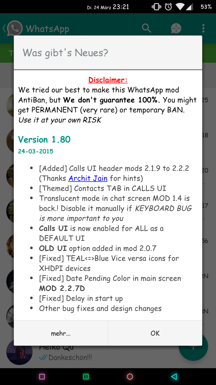 Solange es läuft werde ich nicht wechseln. Ich benutze noch Reborn 1.0. Meine Freundin immernoch WhatsApp Plus 2.76