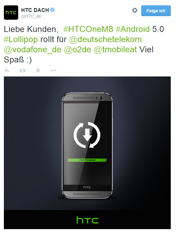 HTC hat soeben per Twitter bekannt gegeben hat, dass der Rollout für das Update auf Android 5.0 Lollipop beim One M8 in Deutschland gestartet wurde.