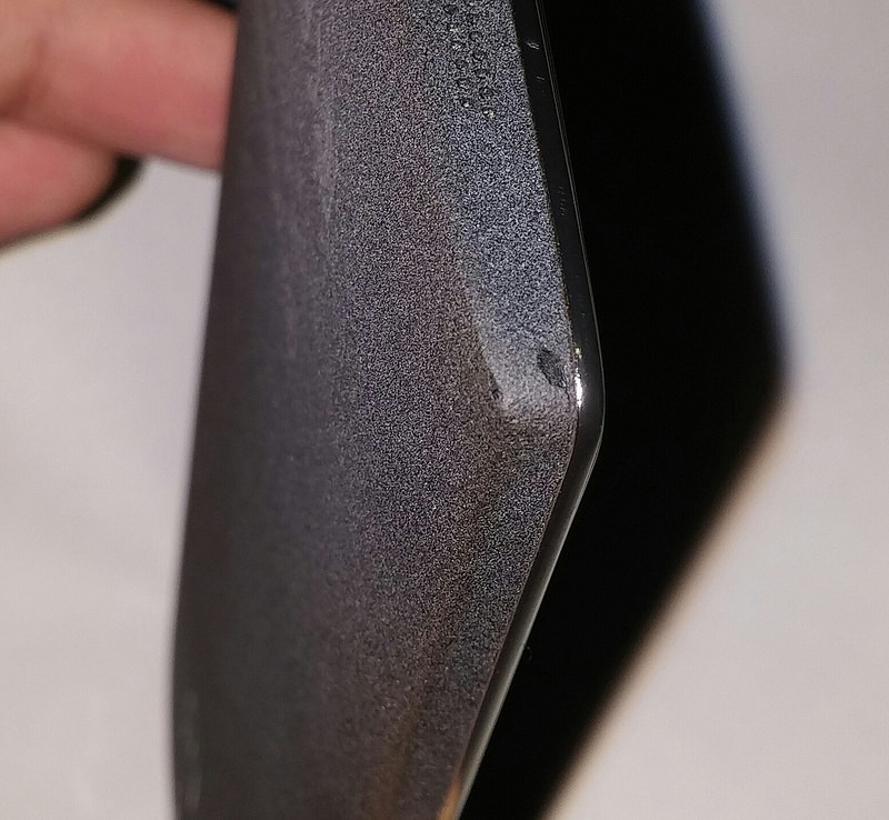 Das Gerät ist jetzt ca. 6 Monate alt und hat mir bis jetzt treue Dienste geleistet. An drei Stellen gibt es kleinere Abreibungen vom Sandstone Cover (s. auch folgende Bilder). Das Display ist kratzfrei, lediglich auf der Echtglasfolie sind welche.