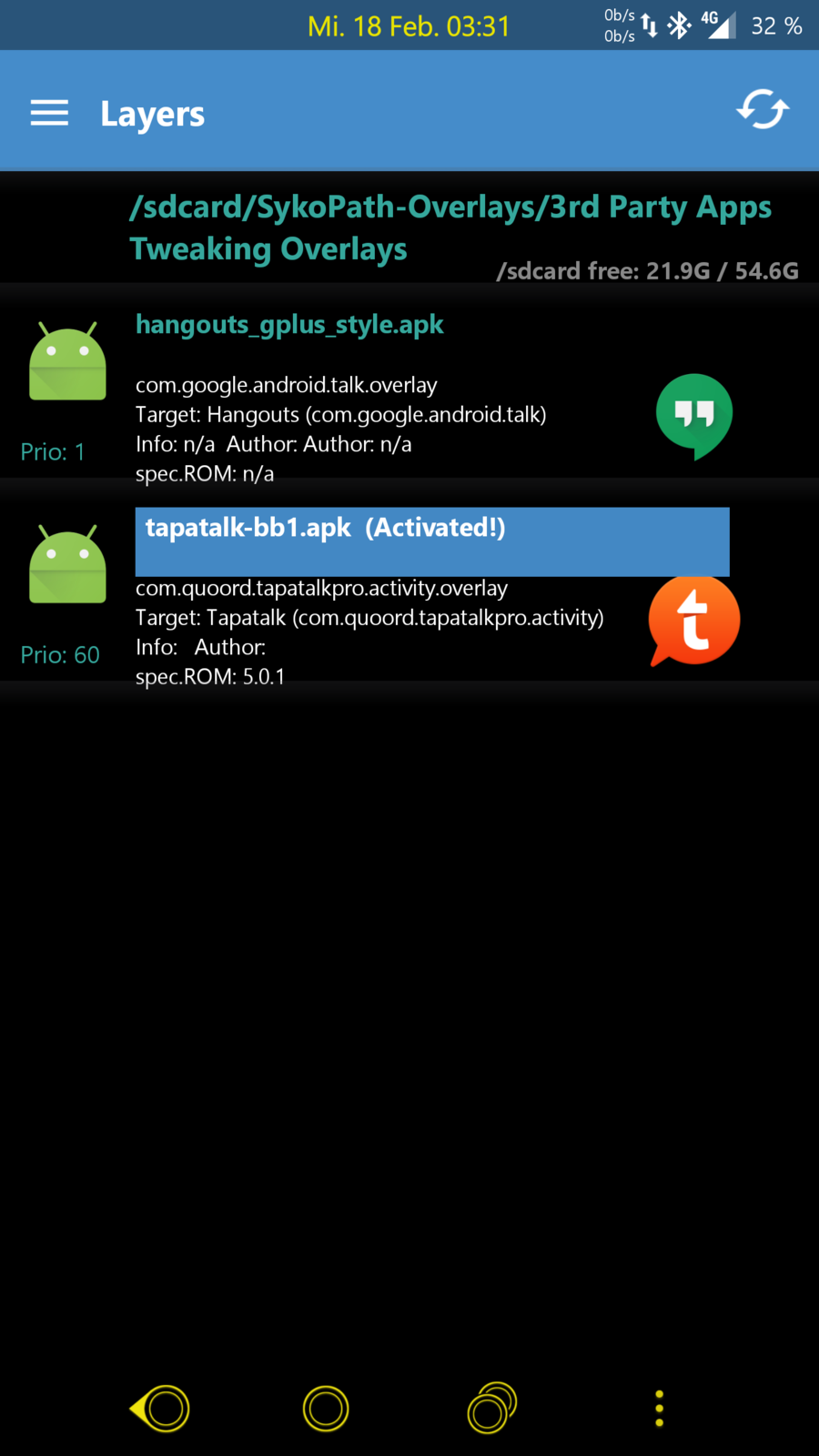 Hab die APP manuell in den Ordner system/vendor/overlay verschoben. Abschließend wie immer reboot.Hatte bisher mit allen layers wunderbar gefunzt.Wäre Klasse wenn jemand es ebenfalls ausprobieren würde black/blue tapatalk.Und berichtet ob es lüppt.https://plus.google.com/10967179786786…sts/9CqiAUTdCKw