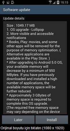 Samsung weist darauf hin, dass sich der verfügbare Speicherplatz nach der Installation von Android 5.0 Lollipop um mindestens 950 MB verringert. Wer also das Update installieren will, sollte dafür sorgen vorher mindestens 3 GB freien Speicher zur Verfügung zu haben.