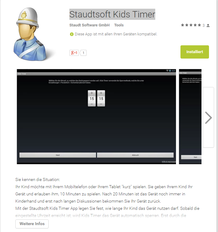 Dazu eigent sich die App Staudtsoft Kids Timer perfekt. Nach einer vordefinierten Zeit macht es einfach *Plop* und das Display geht aus und ist gesperrt. (PIN Sperre vorausgesetzt, sonst macht es keinen Sinn.) Dass schöne ist, dann ist App oder Zeit Schuld und nicht Du als Elternteil. Wer Kinder hat wird wissen was ich meine. Das hat nichts mit Schiss oder Inkonsequenz zu tun sondern es nervt einfach und glaub mir Du willst nicht jeden Tag nach dem Ausschalten oder Wegnehmen des Tablets eine 15min. Diskussion führen, warum er denn jetzt nicht weiterspielen darf.