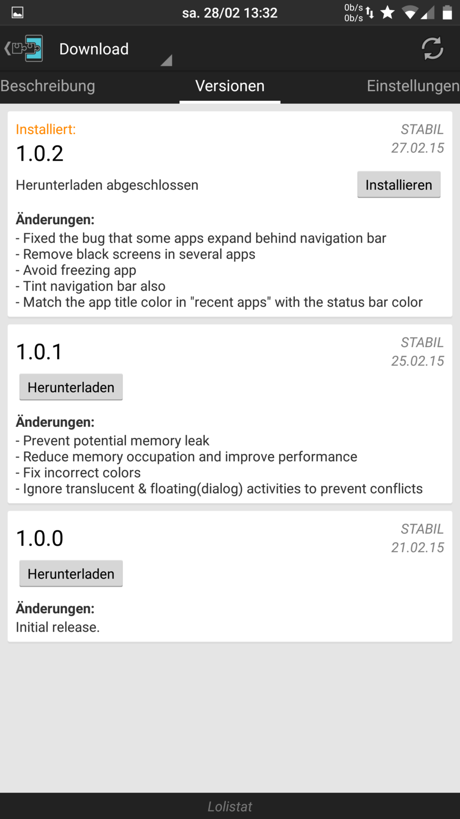Hier will ich euch das xposed Modul LoliStat vorstellen, mit welchem ihr (ähnlich tinted Statusbar) die statusbar in der um einen Farbton dunkleren Farbe wie die Primärfarbe der entsprechenden App darstellen könnt.