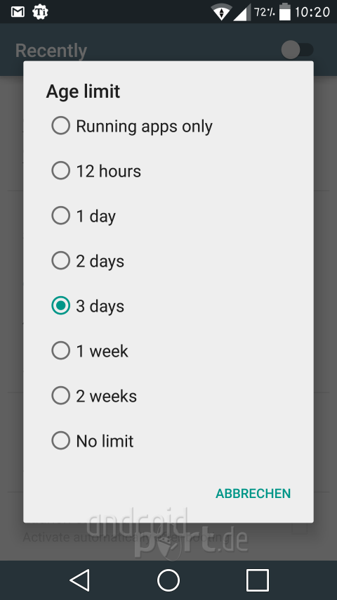 Unter Age limit tragt Ihr die gewünschte Laufzeit der letzten Apps ein, seitdem sie gestartet aber nicht noch einmal benutzt wurde.