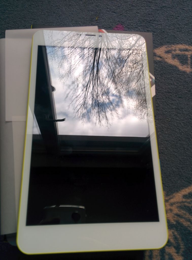 Die Standardfolie spiegelt auch. In den Räumlichkeiten ist es gut zu betrachten. Bei Sonnenschein auf der Terrasse gibt es Probleme. Auch wenn die Sonne sich im Rücken befindet, so strengt es doch die Augen an. Ist aber mit jedem Tablet so. Außer mit den echten e-Book-Readern.