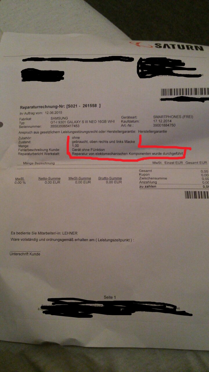 So nun am 17.06.15 konnte wir das Handy wieder abholen und auf der Reperaturrechnung stand folgendes!!Siehe Anhang!!