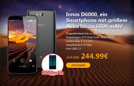 Innos setzt auf zwei verschiedene Zellen. Das Smartphone hat nicht nur einen fest verbauten Akku mit 2.480mAh, sondern auch einen zusätzlichen, wechselbaren Akku mit 3.520mAh Kapazität. Die Zellen kann eine Betriebszeit von 3 bis 5 Tagen bei starker Beanspruchung abliefern. USB Anschluss Als zusätzliches Schmankerl gibt es noch einen USB 3.1 Typ-C Anschluss mit dazu.