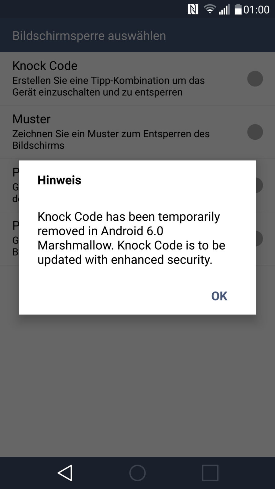 KnockCode geht jetzt! (kommt beim auswählen zwar noch das popup, dass es in einem späteren update integriert wird aber danach kann man den knockcode erstellen)
