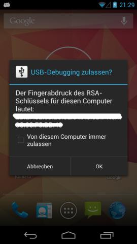 [/FONT]Ab JB 4.2.2 gibt es eine Sicherheitsabfrage. Diese muß auf dem Gerät zugelassen werden. (Siehe Bild)