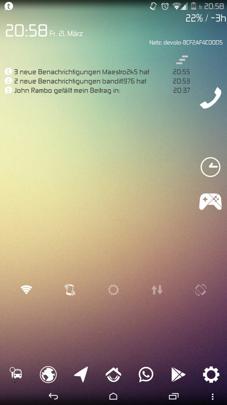 Notifications für G+, Hangouts, Tapatalk, WA+ / Toggles für Wifi, Bluetooth, Lautstärke hoch oder runter (für den Medienplayer ganz lustig). Sowas halt. Also bei Interesse die Dateien in diesem Posting nach unten laden und in Tasker importieren.