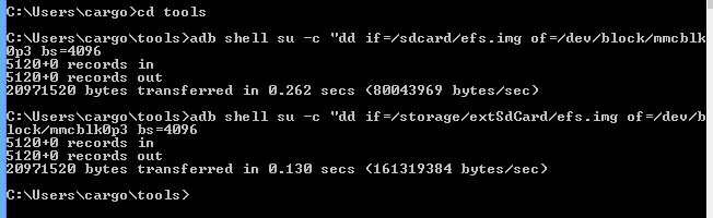 4. zur Wiederherstellung des EFS Ordners [COLOR=#b22222]vom internen Speicher[/COLOR] das eintippen: adb shell su -c "dd if=/sdcard/efs.img of=/dev/block/mmcblk0p3 bs=4096