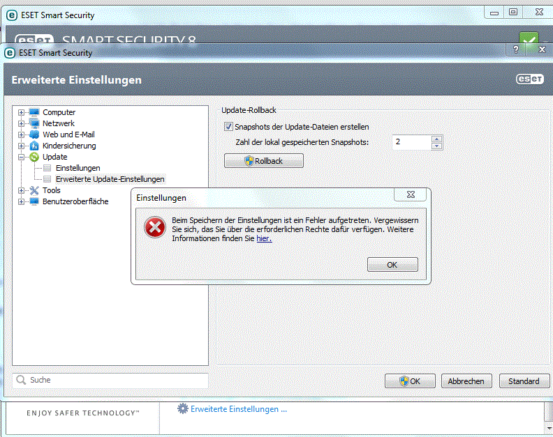 ESET deinstalliert und dann in Win mit abgesicherten rein + ESETUninstaller noch mal geputzt. Wo ich die Version 8 frisch installierte sind neue Fehler gekommen. *Siehe Anhang Bild* Mir kommt es so vor das das rüberbügeln auf V7 weniger Fehler macht wie bei frisch neu Installation. Ich habe nun wieder V7 installiert und V8 rübergebügelt. Rechner rennt und es kommen keine Fehler. Auch nicht im Tray anhalten nach Wunsch. Die Systembelastung ist in der rübergebügelten Version weit geringer. Wenn ich ESET öffne und flink zwischen den Menü springe hängt ESET etwas. Ich habe 8 GB DDR 2 da sollte es flotter laufen.