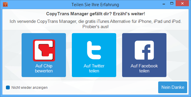 Das war's auch schon. Mit CopyTrans Manager könnt Ihr eure Musikmediathek einfach und individuell verwalten. Und das Beste ist: CopyTrans Manager ist und bleibt kostenlos! Wenn’s euch gefällt, freuen wir uns übrigens über shining ★★★★★ auf chip.de, einen Tweet oder Like. Viel Spaß!