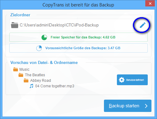 3. Wählt einen Zielordner aus. Falls Ihr einen anderen Zielordner auswählen wollt, klickt einfach auf das blaue Stift-Icon. Um die Sicherung zu beginnen, tippt auf "Backup starten".