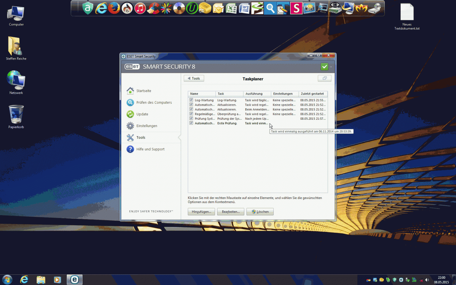 Nach gewünschten Rechner Neu Start war das ESET Tray Logo nicht aktiv. Ich brauchte 5 Computer Start bis das Teil nun erschienen ist. Mal ganz ehrlich das geht bei manchen zweit Klassen AV Anbieter auf anhieb beim ersten mal. Auch verstehe ich den ESET Task Planer nicht. Warum sind Task noch eingetragen die normal nur einmal nach Installation über die Bühne laufen ? Siehe Bild.