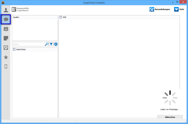 2. Klickt auf der linken Programmleiste auf die Sprechblase und wartet bis die Nachrichten geladen und im Programm angezeigt werden. Je nach Datenvolumen kann es kann es einen Moment dauern.