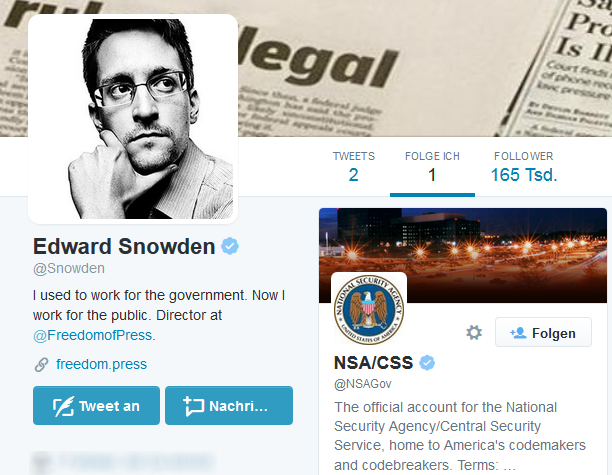 Aktuell hat Snowden nur über 160 Tausend Follower und Beobachtern zufolge soll er allein in den ersten 5 Minuten über 30 000 bekommen haben.