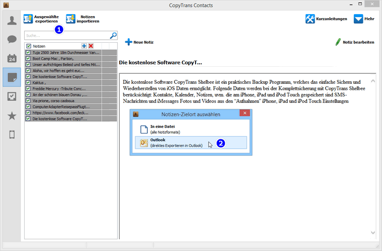 1. Habt Ihr CopyTrans Contacts bereits heruntergeladen und am PC installiert, klickt auf das Notiz-Icon links im Programmfenster. Wählt "Notizen importieren" und im nächsten Fenster wählt Ihr als Notizenquelle gleich "Outlook" aus.