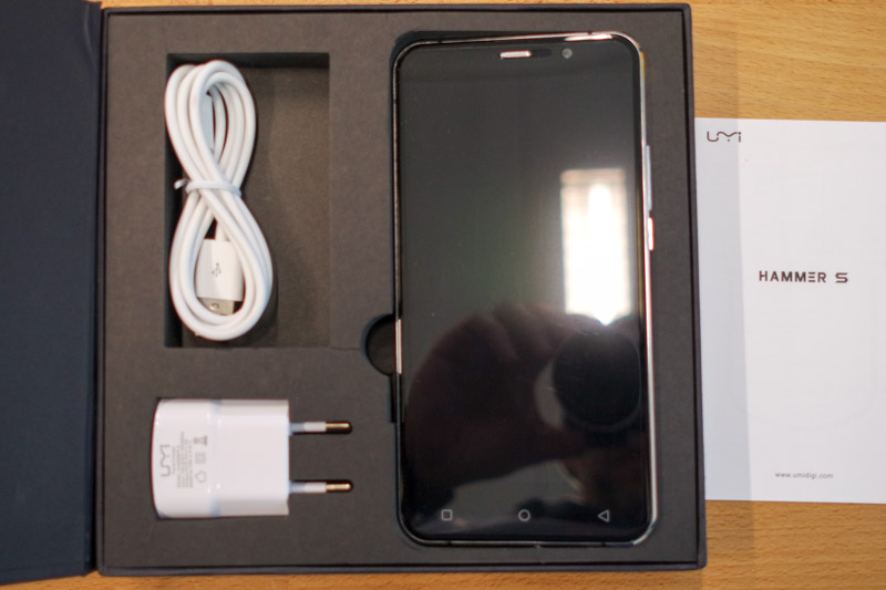 Das UMI Hammer S kommt in einer schicken, schmalen, quadratischen grau-silbernen Box daher. Im Lieferumfang enthalten ist natürlich das UMI Hammer S, ein USB Typ-C Kabel, ein Ladeadapter der hochwertig wirkt und eine Kurzbeschreibung.