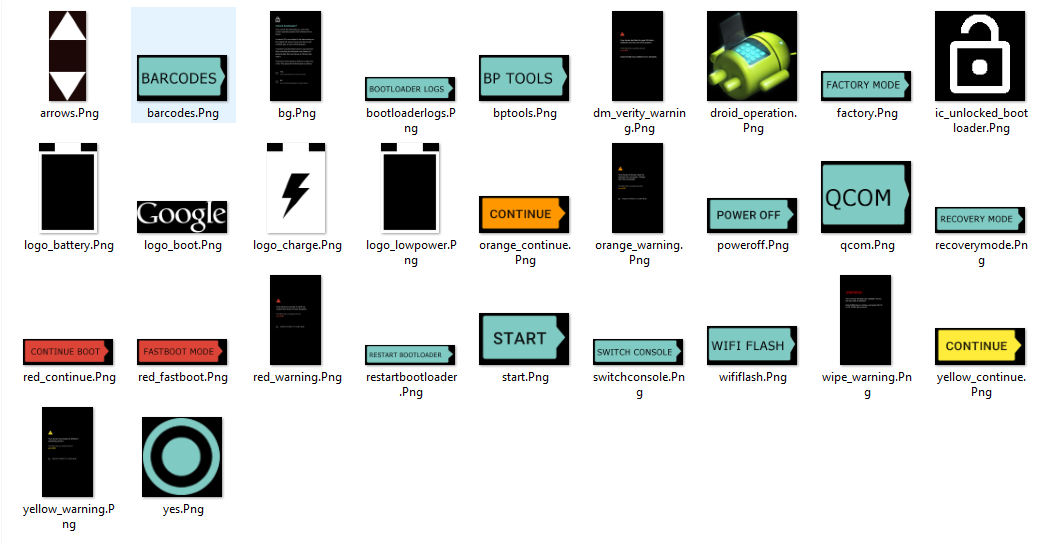 Beispiel: aktuelle bootloader-shamu-moto-apq8084-71.15.img vom Nexus 6 Factory Image 6.0.1 - entpackte PNG's die geändert werden könnten