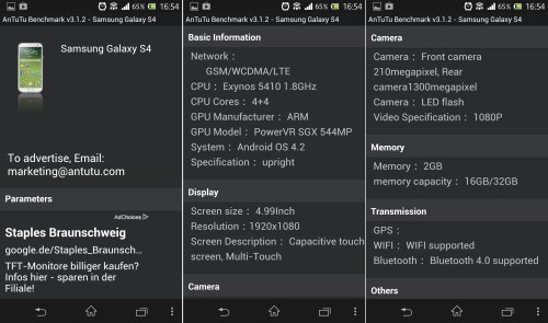 Den Daten ist ebenfalls zu entnehmen, dass das S4 mit einem Exynos 5410 Achtkernprozessor ausgestattet sein wird, den Power VR SGX 544MP-Grafikprozessor besitzt, über ein 4,99 Zoll großes Full HD-Display verfügt, mit 2 GB RAM ausgestattet ist und auf der Rückseite eine 13 MP-Kamera besitzt.