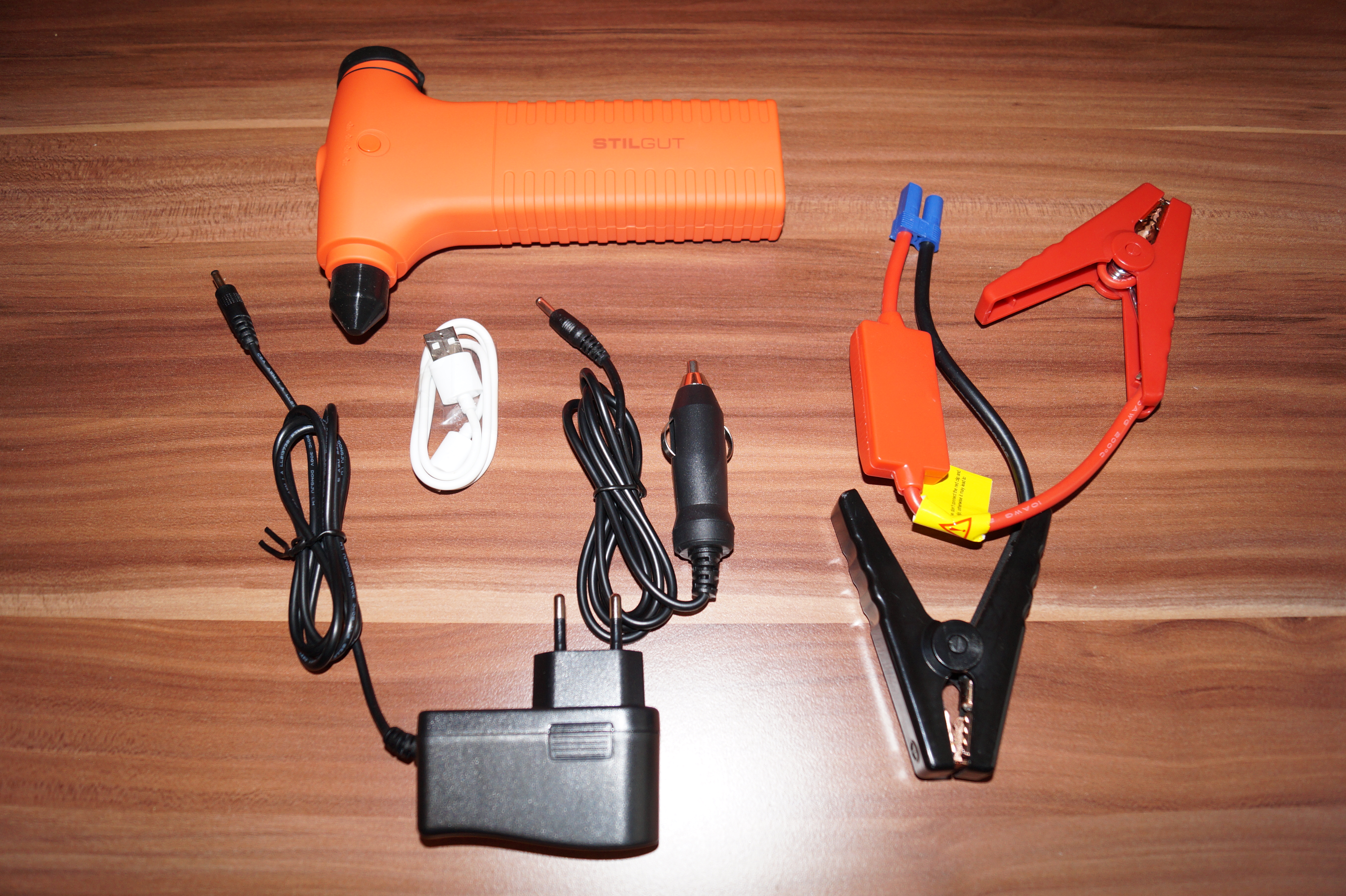 - 1 x StilGut Steel Auto-Starthilfe mit Powerbank 7.800 mAh und Nothammer sowie Taschenlampe