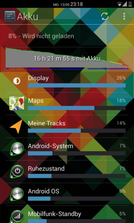 Habe mit meine Tracks 2:10h mit GPS aufgezeichnet, maps viel benutzt und Internet Abundzu. Synchron war an und trotzdem 2:30h Display onGesendet von meinem Nexus 4