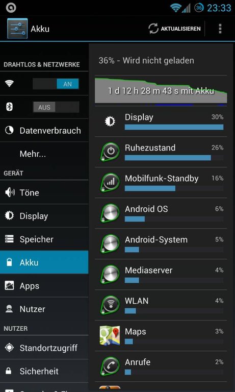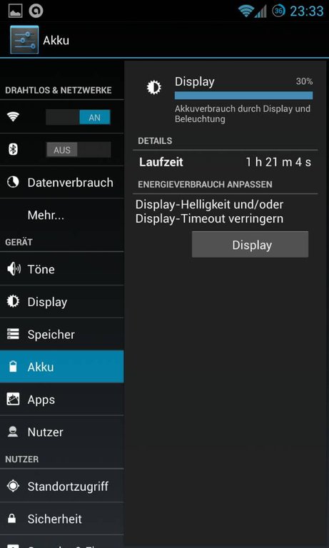 25h Gesamtlaufzeit davon 4h 15min Display on, mit WLAN und 3G abwechselnd erreicht. Dazu ca. 7 Std bei wirklich schlechtem Empfang