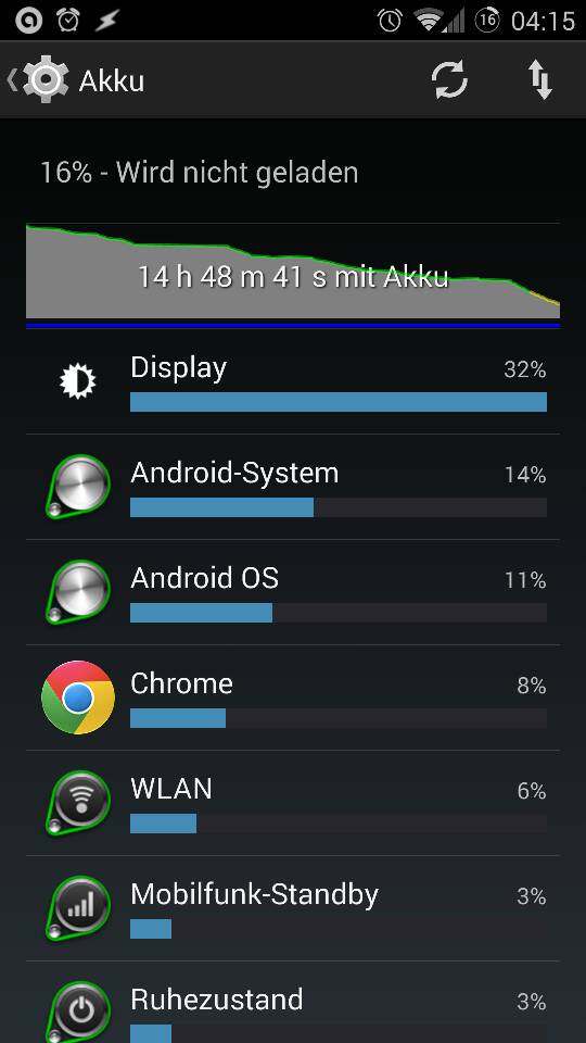 Heute habe ich dann mal unter selben Bedingungen mit dem linaro Kernel (basiert auf franco) da hatte ich in dieser Stunde nur etwas mehr als 20 % verloren.