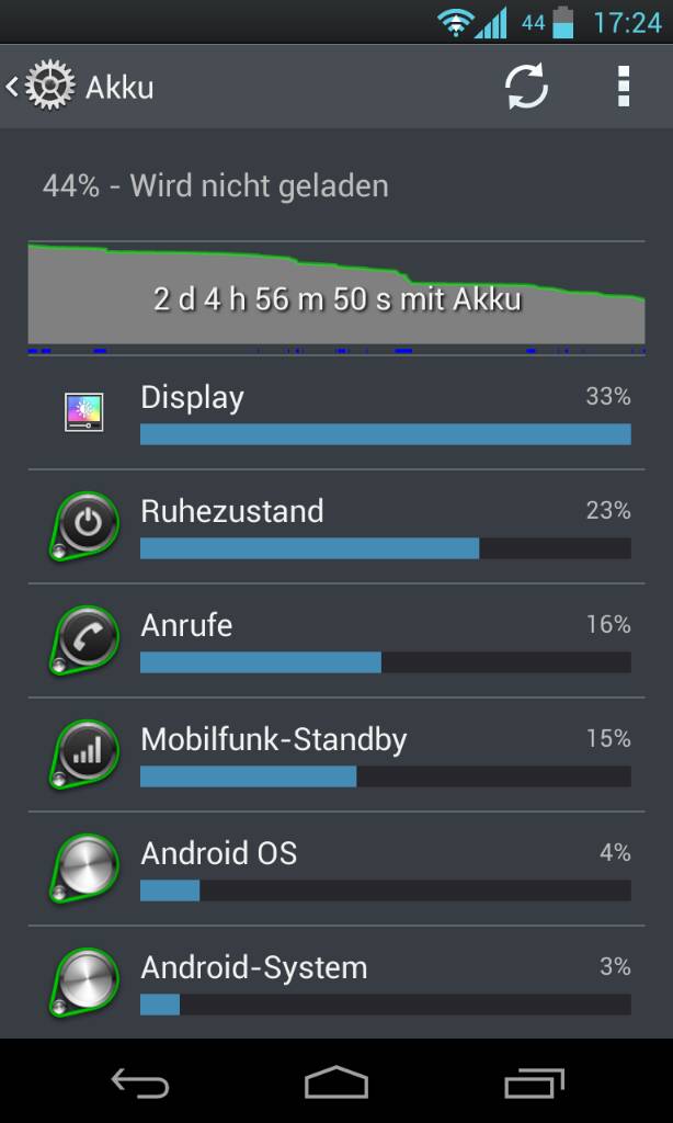 Genau das wollte ich ja damit zeigen... Im Deepsleep nahezu keinen Verbrauch. Hatte ja noch 44 Prozent Akku über. Das heisst ich komme mindestens über 4h Screen On Time.