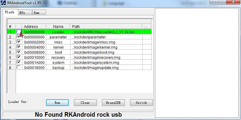 4. Wenn das Tablet im Loader-Modus erkannt wird, klicke auf "Erase IDB" und warte bis der Dialog erscheint, das der Vorgang abgeschlossen ist.