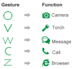 Das Elephone G6 kommt in einem ergonomischen Design welcher einfach perfekt in der Hand sitzt. Damit dieser auch noch gut mit einer Hand bedienbar ist fällt diese 5 Zoll aus und besitzt eine Auflösung von 1280×720 Pixeln. Das ergibt einen PPI von 293. Im Inneren wird ein MTK6592 CPU verwendet, welcher eine Frequenz bis zu 1.7GHz erreichen kann. Somit sollten alle Eingaben und Steuerungen flüßig ohne Ruckeler funktionieren. Die Hauptkamera misst 13MP und besitzt eine f/2.2 Blende. Die Frontkamera misst nur 2MP. Ich selber habe dieses Smartphone auch noch nicht zur Hand gehabt. Aber für mehr als einige Schnappschüsse sollte das G6 wohl nicht reichen. Mit anderen Worten, hier sollte man die Erwartung wohl nicht zu hoch setzen. Aber ich kann mich auch irren. Ein Augenscheinliches Highlight des Elephone G6 ist die Fingerdruck Identifikation mit dem eine größere Sicherheit angeboten werden soll. Beispielsweise können Sie auf diese Weise Ihr Bildschirm entsperren. Ob man diese Funktion dann auch nutzen möchte, bleibt dann einem selber überlassen. Dem Trend entsprechend gibt es auch beim Elephone G6 die Gestenerkennungs-Funktion. Auf diese Weise kann durch das Schreiben eines “O” direkt die Kamerafunktion aufgerufen werden usw. Hier ein Screenshot zu dieser Funktion, welche Befehle ausgegeben werden können.