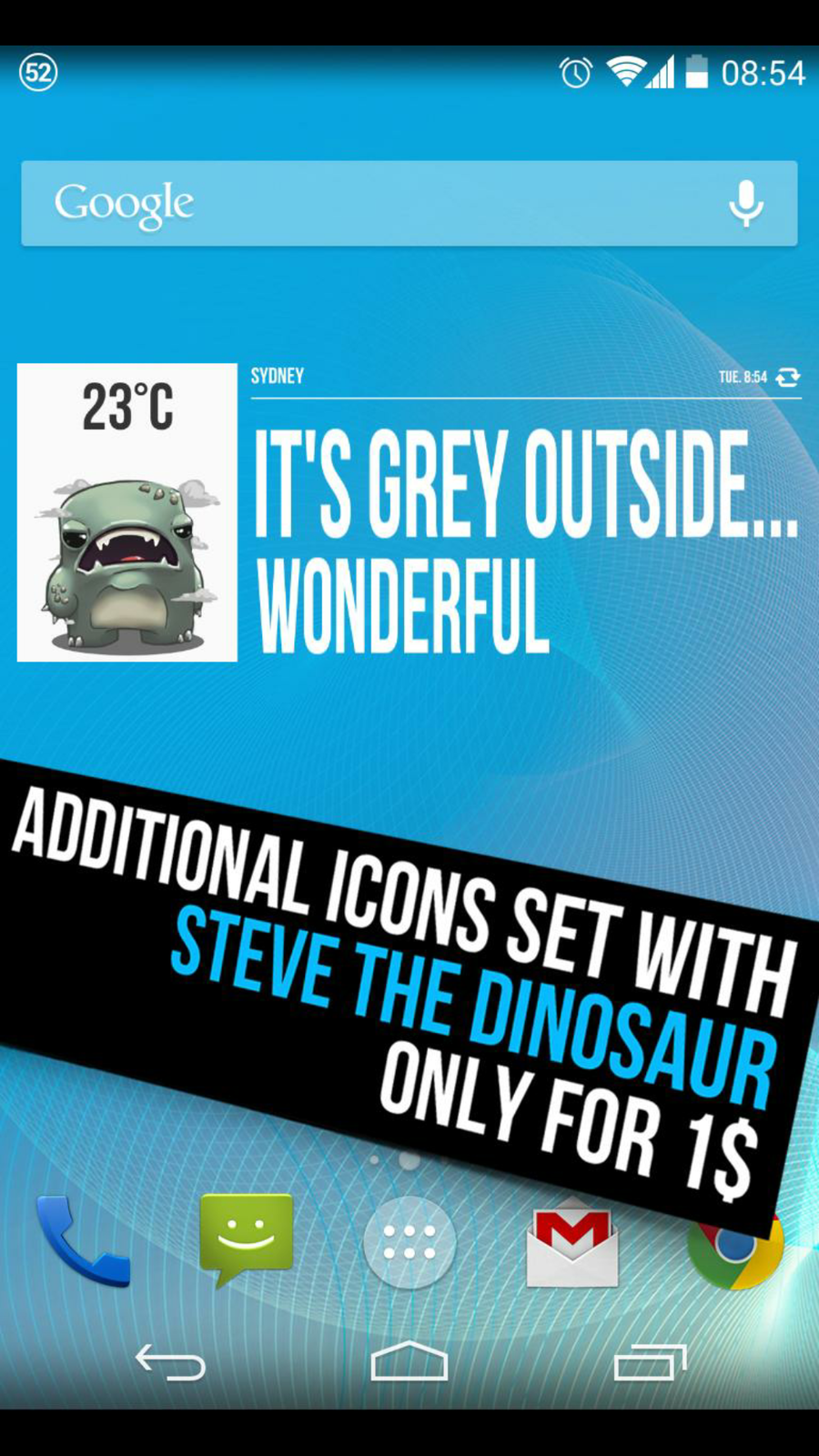 Grumpy Weather ist ein schlichtes aber liebenswert schlecht gelauntes Wetter Widget, was sich von den herkömmlichen unterscheidet. Der Unterschied ist das mit Hilfe von niedlich gezeichneten Kreaturen das Wetter anzeigt wird. Insgesamt sind aktuell fünf Charaktere verfügbar. Diese kann man für 91 Cent über die App dazu kaufen. Aber auch ohne diese Extras zu kaufen, ist die App sehr lustig anzusehen.