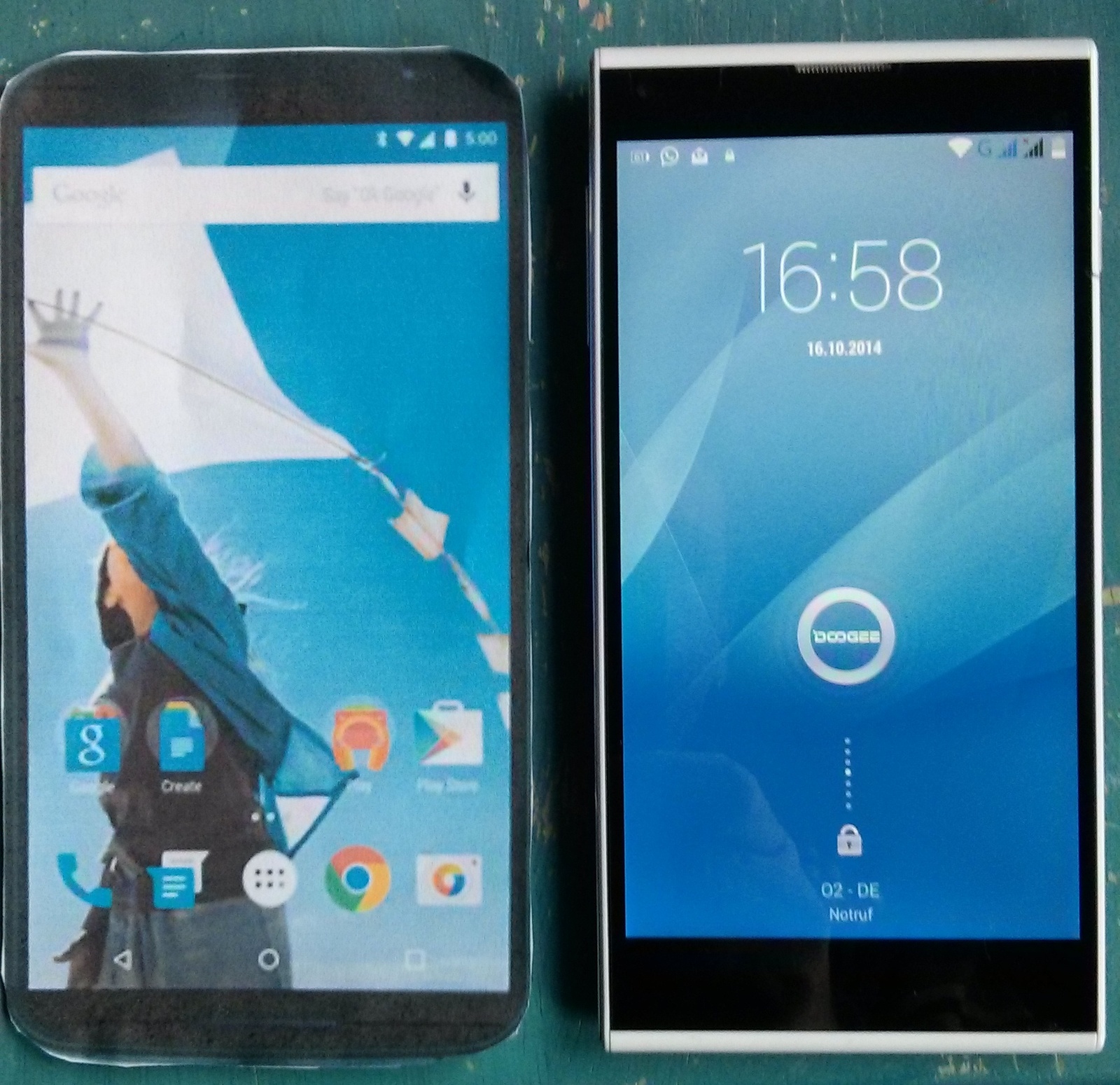 Das ausgeschnittene Nexus 6 habe ich mal neben das China Phone meiner Frau gelegt, das 5,5 Zoll hat. Die Abmaße sind ungefähr gleich. Man kann aber sehen, das der Bildschirm grösser ist.