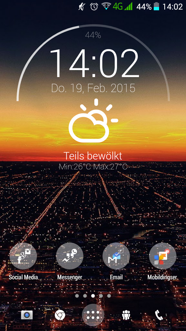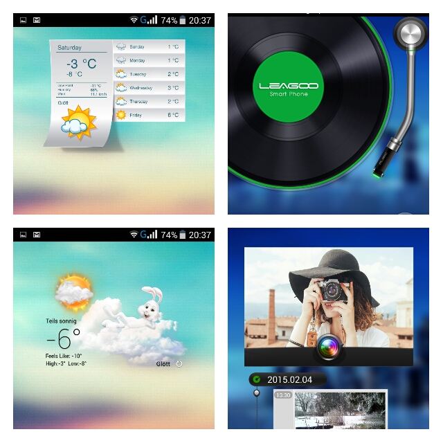 Basis ist Android 4.4.2 mit 2 (!) Launchern vorinstalliert: dem Google und einem hauseigenen LEAGOO Launcher. In den Einstellungen kann ich festlegen welcher Launcher aktiv ist; und wenn ich den LEAGOO Launcher wähle darf ich mir vorgefertigte hübsche Themes aussuchen. Hübsch gelöst finde ich.