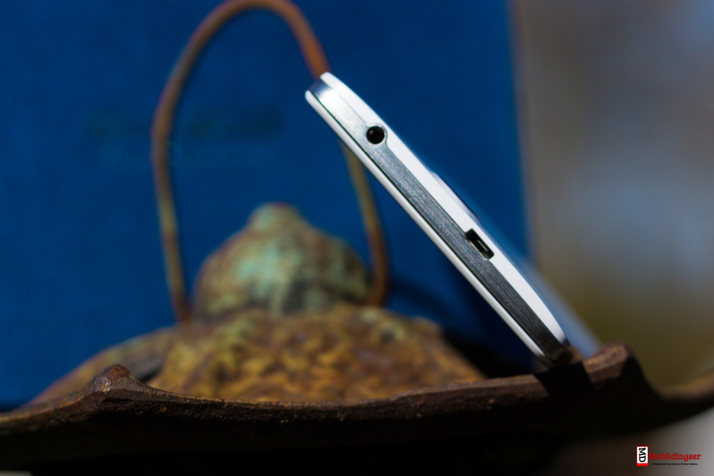 Kommen wir nun dazu, was so rund um das UMi Hammer los ist. Auf der Kopfseite dieses Smartphones sind der 3,5mm Kopfhörerbuchse und der Micro-USB-Anschluss untergebracht. Auf der rechten Seite finden wir den Power-Button (Ein-/Aus-Schalter) und dem üblichen Lautstärkeregler. Auf der Unterseite gibt es nur eine kleine Öffnung hinter der sich das Mikrofon versteckt und die komplette linke Seite des UMi Hammer ist “clean”.