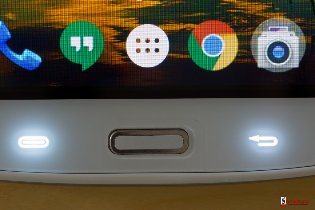 Auf der Vorderseite des Smartphones präsentiert sich an der Oberseite die Hörmuschel sowie eine 5 Megapixel Front-Facing-Kamera und an der Unterseite sind minimalistisch die kapazitiven Tasten mit einem silbernem Akzent eingelassen. Diese passen hervorragend zu Gesamtoptik mitsamt dem Aluminium-Rahmen und vermitteln so einen stimmigen Eindruck. Die Anordnung der Tasten scheint hierbei von Samsung übernommen worden zu sein. Links befindet sich die "Menü-Taste", mittig der "Home-Button" und rechts der "Zurück-Button". Diese Anordnung ist für mich persönlich etwas ungewohnt und empfinde ich empfinde diese als leichten Rückschritt, da der relative häufig genutzte “Zurück-Button” wesentlich schwerer zu erreichen ist, gerade bei einem Gerät in dieser Größe. Des Weiteren finde ich auf die Schnelle kein "Multitasking-Button".... aber es gibt eine solche Funktion! Dieses Feature wird durch längeres betätigen des "Home-Button" aktiviert.
