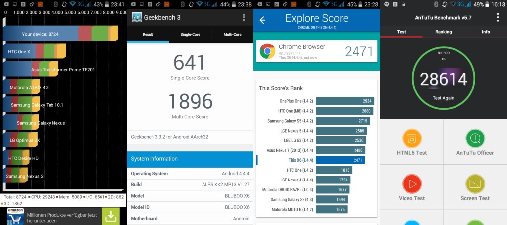 Die Verarbeitung ist super. Die Rückseite für mich ein Highlight. Das Display ist gut, schöne Farben, starke Kontraste. Die Auflösung ist jedoch zu gering bei 5,5-Zoll. Mit dem internen Speicher von 8 GB bin ich schnell an meine Grenzen gekommen. Zudem hat Bluboo den Speicher noch aufgeteilt ( in 2GB und den Rest), so musste ich teilweise Apps auf den anderen internen Speicher verschieben. Die Performance ist für den normalen Nutzer ausreichend. WhatsApp, Telefonieren und surfen erledigt das Bluboo ohne Probleme und selbst 3D-Spiele stemmt es problemlos. Hat man jedoch zu viele Anwendungen im Hintergrund auf, nimmt sich das X6 gerne mal eine “Denkpause”. Hier sind 2 GB Arbeitsspeicher mehr als sinnvoll. Android 5.0 Lollipop soll ja nochmal was an Performance raus holen und laut Bluboo, soll der “Lutscher” auch seinen Weg auf das X6 finden. Die Kamera konnte mich nicht vollständig überzeugen. Während der Funktionsumfang der Kamera-App wirklich klasse ist, ist die Qualität der Bilder verbesserungswürdig. Für Schnappschüsse langt es jedoch allemal. Die Lautstärke über die Kopfhörer waren mir zudem zu leise. Auch gibt es noch einige nicht übersetzte Punkte im Menü des X6.