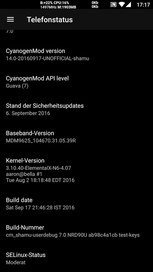 - CPU governors: barry_allen, blu_active, chill, conservative, darkness, elementalx, impulse, interactive (default), nightmare, ondemand, performance, userspace, zzmoove