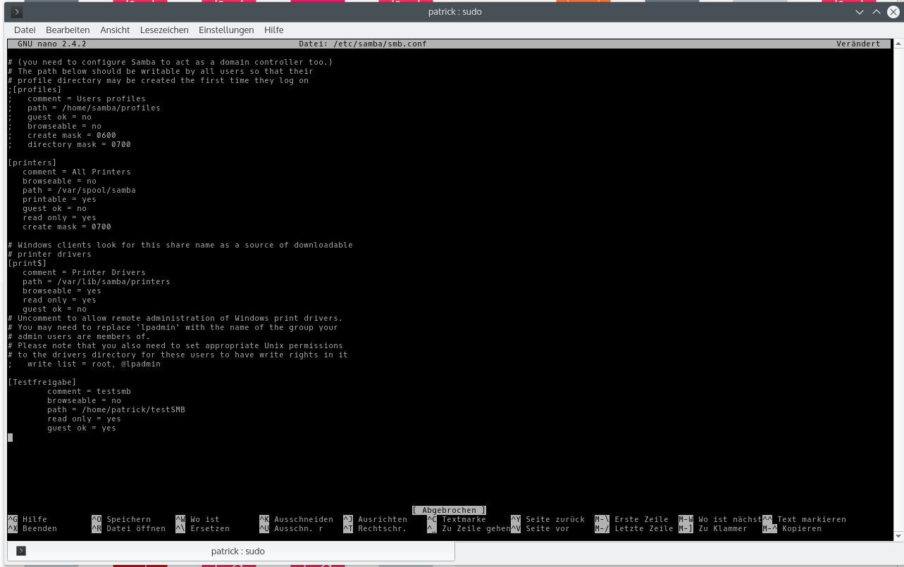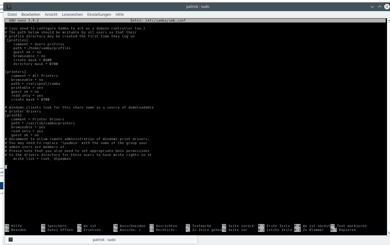 nun öffnet sich ein Terminal Texteditor mit dem inhalt der smb.conf. (Die Config Datei von den Samba Server)