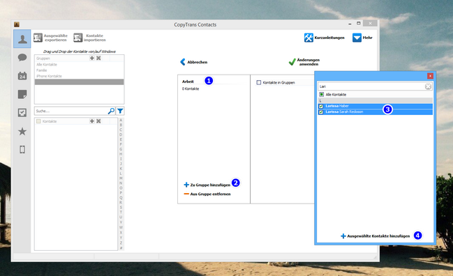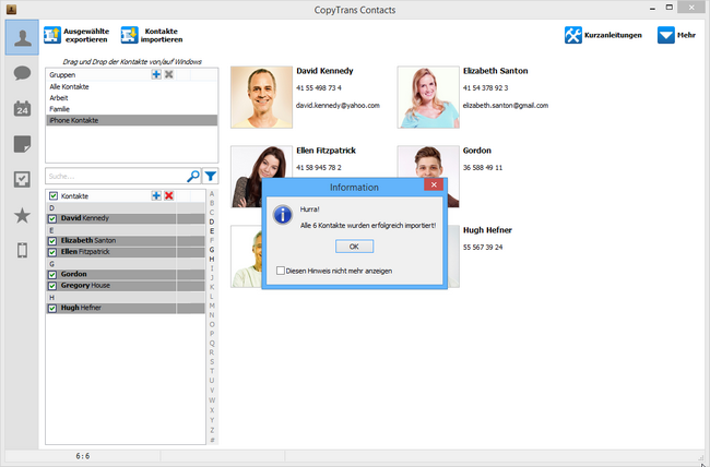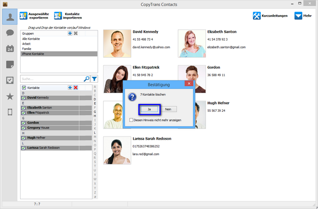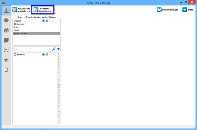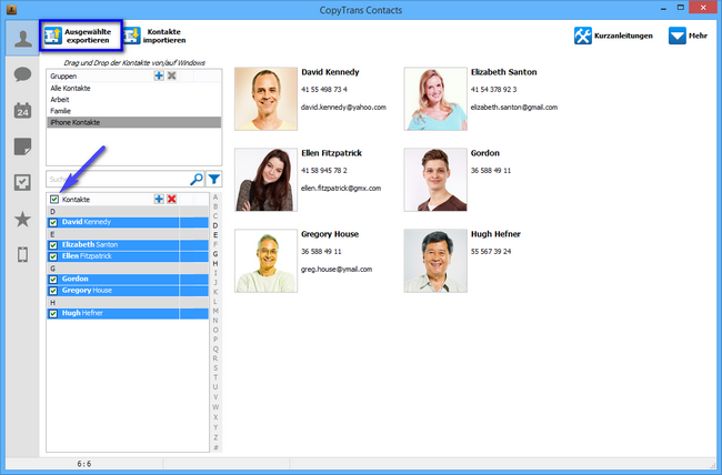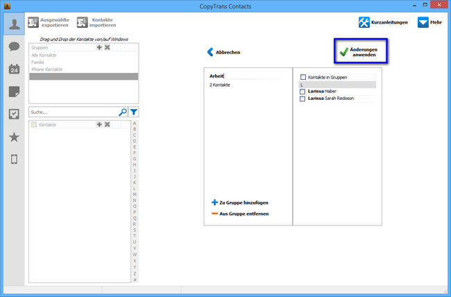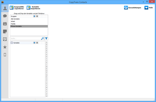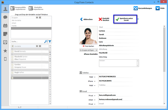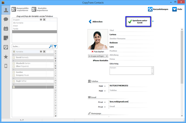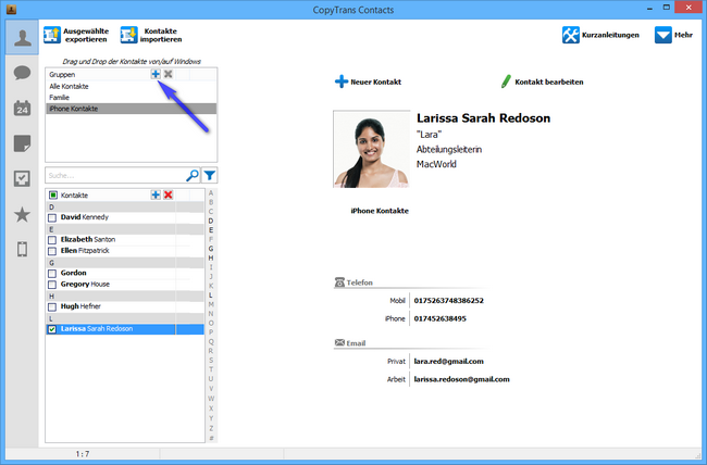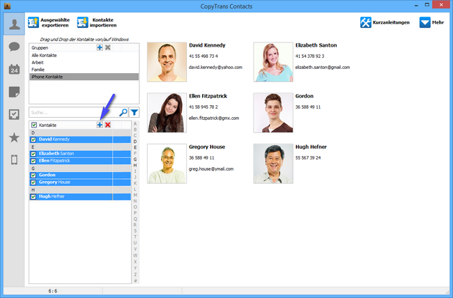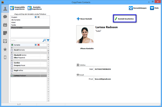 CopyTrans Contacts ist DAS Programm fürs einfache Verwalten von iPhone Kontakten. Sichert und stellt iPhone Kontakte im Handumdrehen wieder her. Kontakte können bearbeitet und gruppiert werden. Zudem kann man nicht nur einzelne Kontakte löschen, sondern auch gleich ganze Telefonlisten.