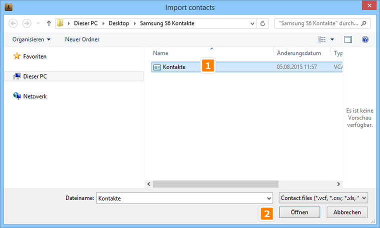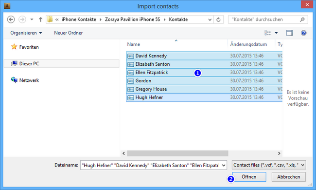 [size=14]3. Jetzt könnt Ihr alle Kontakte am PC auswählen die Ihr zum iPhone importieren möchtet. Habt Ihr die Auswahl getroffen, klickt auf "Öffnen". [/SIZE]