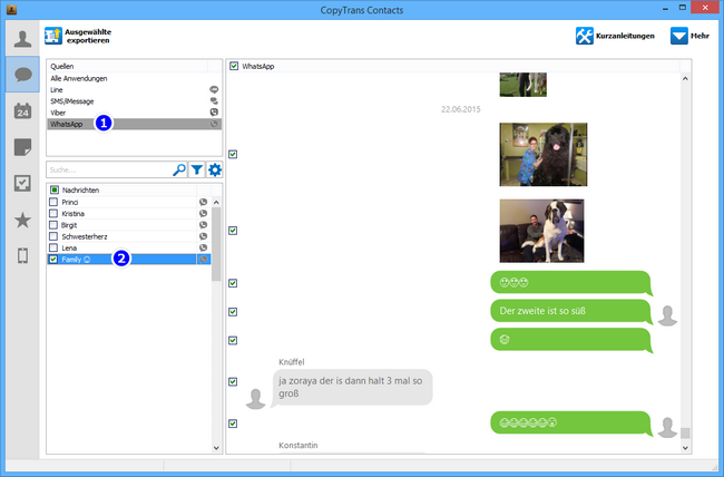 1. Nachdem Ihr CopyTrans Contacts heruntergeladen und installiert habt, öffnet das Programm und schließt das gewünschte iDevice an. Wartet einen Moment, bis die Kontakte im Programm geladen wurden. Markiert alle Kontakte, die Ihr zum PC exportieren möchtet. Habt Ihr alle ausgewählt, klickt auf dem oberen Reiter auf "Ausgewählte exportieren". [/SIZE]